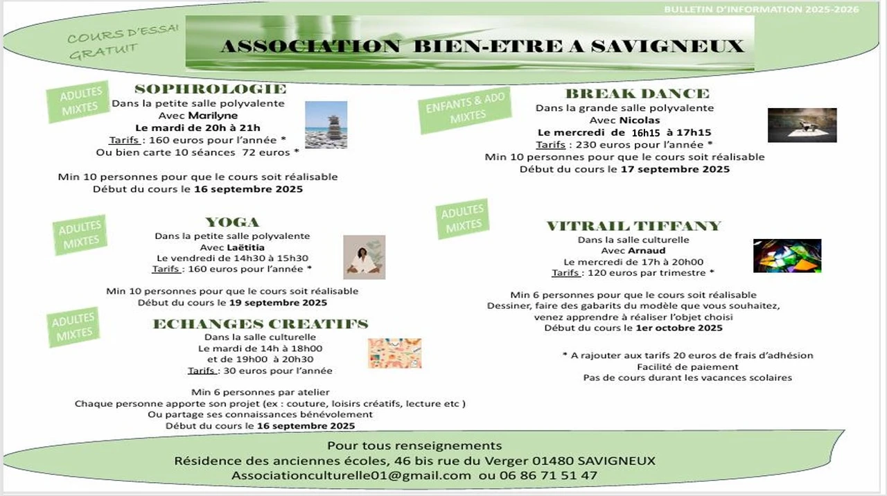 Contactez la présidente de l'association madame Anna Descollonges : associationculturelle01@gmail.com ou 06 86 71 51 47 pour tout renseignement